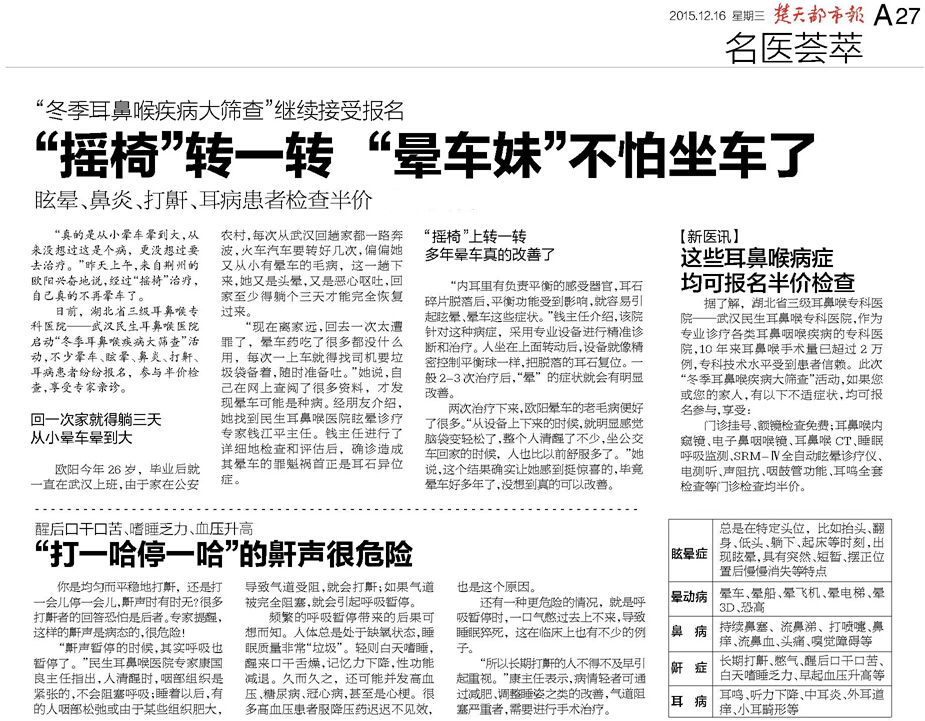 “内耳里有负责平衡的感受器官,耳石碎片脱落后,平衡功能受到影响,就容易引起眩晕、晕车这些症状。”钱主任介绍,该院针对这种病症,采用专业设备进行准确诊断和治疗。人坐在上面转动后,设备就像精密控制平衡球一样,把脱落的耳石复位。一般2-3次治疗后,“晕”的症状就会有明显改善。