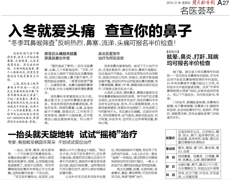 ¡¡¡¡ÉÏÖÜ£¬Èý¼¶¶ú±Çºíר¿ÆÒ½Ôº——Î人ÃñÉú¶ú±ÇºíÒ½Ôº¿ªÕ¹“¶¬¼¾¶ú±Çºí¼²²¡´óɸ²é”£¬ÒýÆðһЩÀϱÇÑס¢±Çñ¼Ñ×»¼ÕßµÄÈÈÁÒ·´Ï죬´òÀ´µç»°±¨Ãû°ë¼Û¼ì²é¡£»¹Óв»ÉÙÒ»È붬¾Í°®±ÇÈû¡¢Í·Í´µÄÊÐÃñÒ²·×·×´òÀ´µç»°£¬Ï£ÍûµÃµ½×¨ÒµµÄ¼ì²é¡¢Õï¶Ï¡£