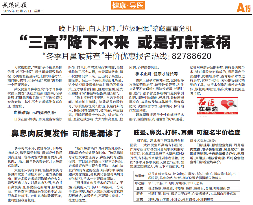 “冬季耳鼻喉筛查”半价优惠报名热线:027-82788620。截止时间:2016-1-31