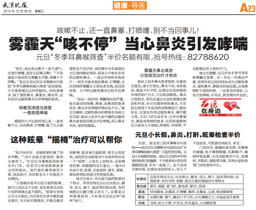 “医生,近我这鼻子一直不通气,还老打喷嚏,是怎么回事儿啊?”“不知道是不是前些天雾霾太严重,咳嗽个不停啊。”近在武汉民生耳鼻喉专科医院“冬季耳鼻喉疾病大筛查”活动现场,不少患者提出这样的疑问。经检查确诊,除了慢性鼻炎、鼻窦炎、咽炎外,还有很多过敏性鼻炎合并哮喘的患者。