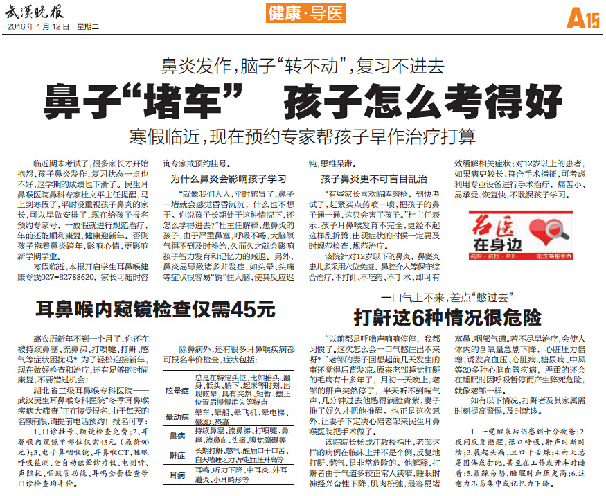 临近期末考试了,很多家长才开始抱怨,孩子鼻炎发作,复习状态一点也不好,这学期的成绩也下滑了。民生耳鼻喉医院鼻科医师杜文平主任提醒,马上到寒假了,平时没重视孩子鼻炎的家长,可以早做安排了,现在给孩子报名预约医师号,一放假就进行规范治疗,年前还能顺利康复,健康迎新年。否则孩子拖着鼻炎跨年,影响心情,更影响新学期学业。