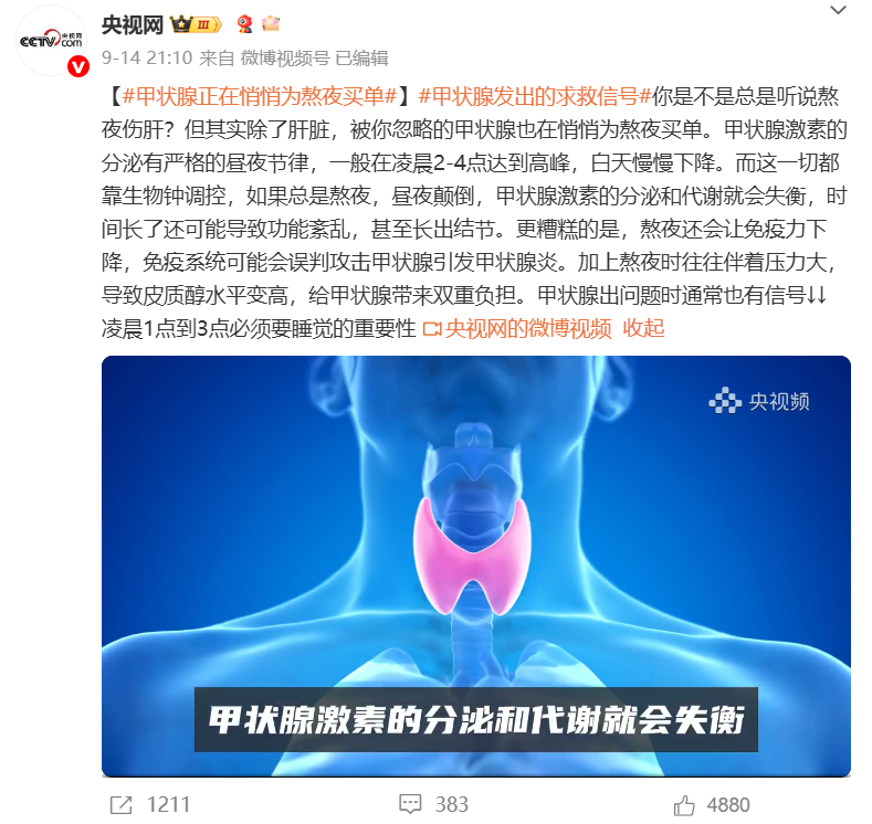 热搜预警!央视网发声:长期熬夜正在摧毁你的甲状腺